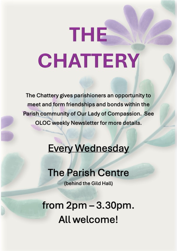 Next Wednesday, 26th November, The Chattery will be holding their annual “CHRISTMAS BUFFET LUNCH”. Starting at 1.30pm, in the Parish Centre, at the rear of the Gild Hall. Karina & Friends will be providing the entertainment with a special Christmas 🎄 Musical Afternoon and there will be a bumper Christmas Raffle with some wonderful prizes. Event tickets are £8 each and parishioners and friends can call Pam Dunne on 871381 to make a booking.